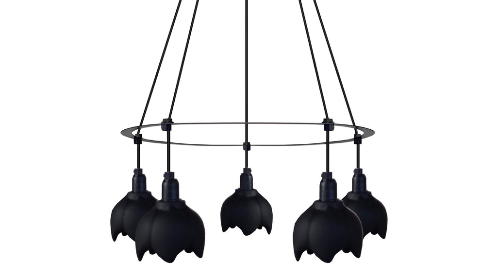 Lustre ANGKOR -45cm- 5 Lum. Directions multiples x Douille E14-Cordon 60 cm -Abat-jour 10,5cm Verre Abstract Ronde Noir-Ampoule Standard A19 MAXI 40W Halogène Conseillé LED A++ 7W équivalent à 60W Non inclus-Style Charme --Dimensions Long 45xlarg 45xHaut 90 cm