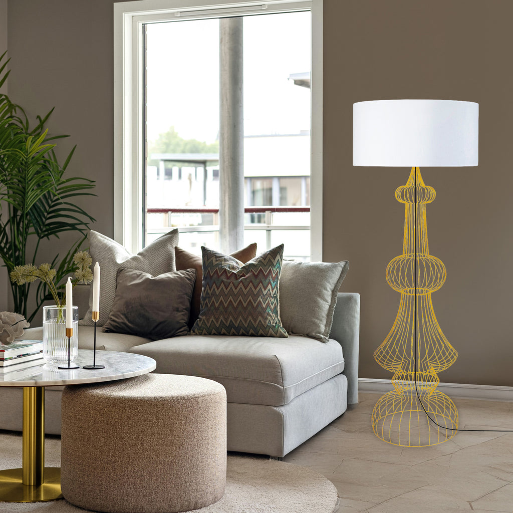 Adicione personalidade à sua sala de estar com este candeeiro de pé de grandes dimensões. Adoramos luminárias de chão como esta peça por sua capacidade de adicionar um pouco de brilho extra a uma sala e complementar seu estilo ao mesmo tempo. Este candeeiro de pé apresenta um design torneado feito de fio de ferro forjado à mão. Na parte superior, um tambor de tecido completa o visual desta peça e ajuda a difundir a luz da lâmpada para sua sala de estar, sala de jantar ou qualquer outro espaço amplo, como lobby, hotéis, restaurantes, escritórios etc.