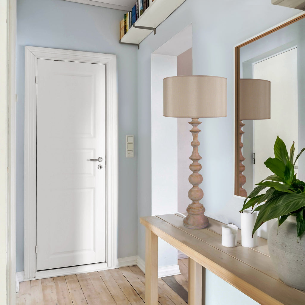 Dê à sua sala de estar ou quarto uma luz reconfortante com este candeeiro de mesa. Pé em madeira maciça, faia, de origem francesa de florestas eco sustentáveis, esta peça apresenta contornos esculpidos que combinam facilmente com a sua poltrona, ou sofá favorito. O abajur de tecido em cor, dá o toque para um estilo subtil e elegante. Sob o abajur, encontra-se a lâmpada E27 de 40w (não incluído), que direciona a luz em várias direções, dando ao seu espaço um toque de requinte e bem-estar.