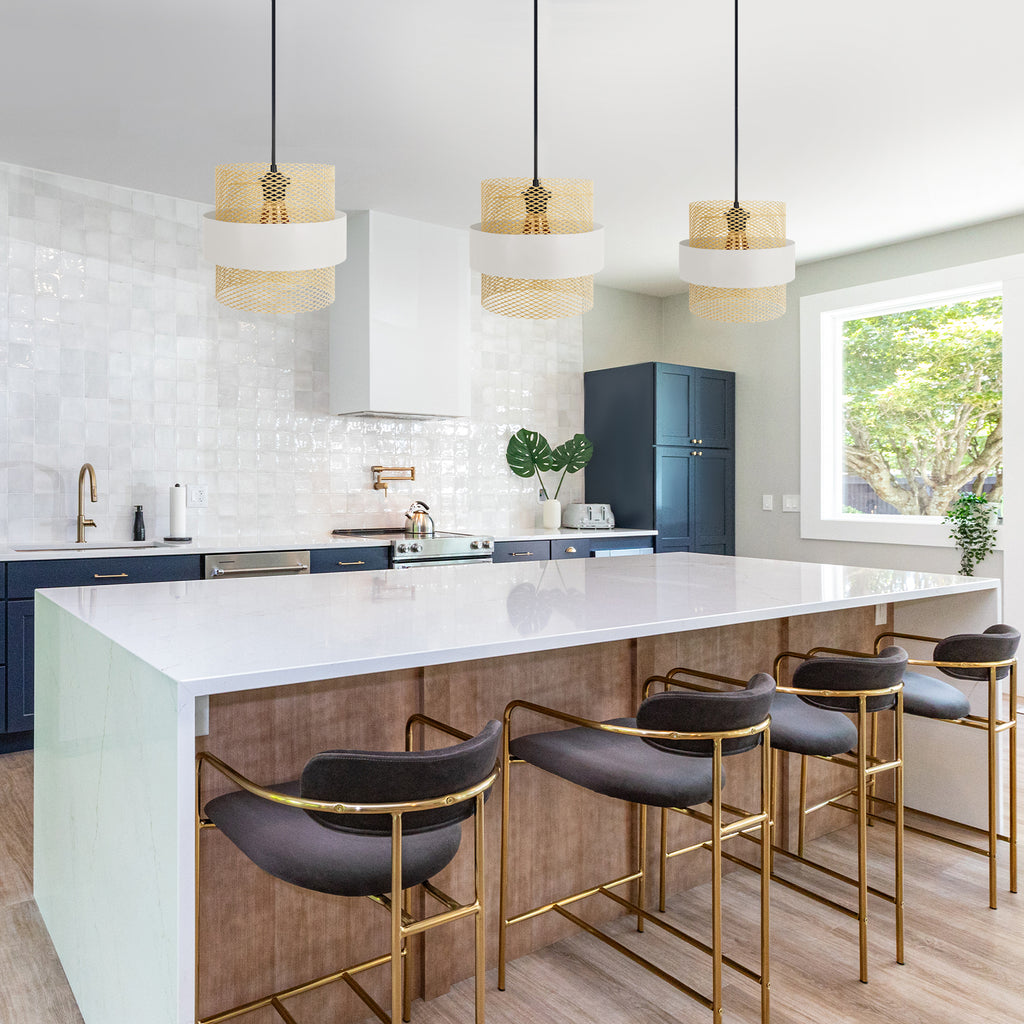 Um design original e uma cor interior dourada, estas são as qualidades que estes pendentes representam. Um conjunto de 3 peças permite-lhe jogar com diferentes posições e alturas Luz ideal para uma cozinha ou sala de estar para realçar a decoração do seu interior. Este produto é feito de chapa de aço 100% reciclável. -