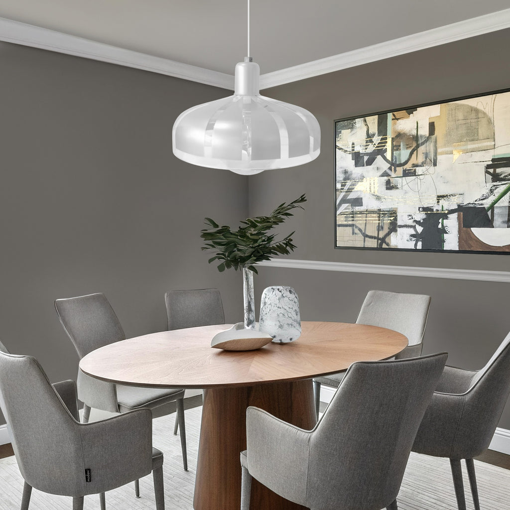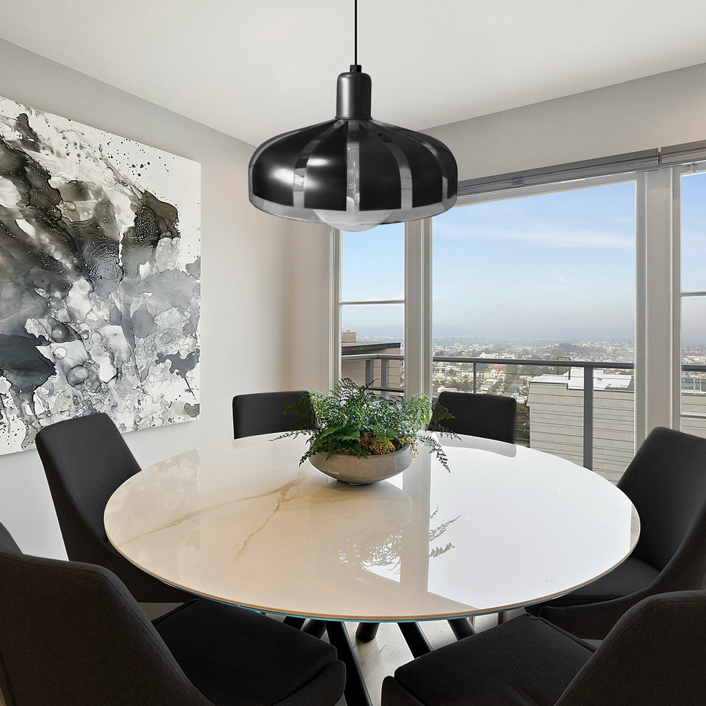 Um candeeiro suspenso inspirado na iluminação das fábricas de outrora. A difusão de uma luz ampla, generosa e cálida. O seu abajur confere-lhe carácter, mantendo-se modesto e não imponente. Ideal numa entrada, numa cozinha ou num quarto, bem como em salões, bares, restaurantes, cafés, em várias unidades. -